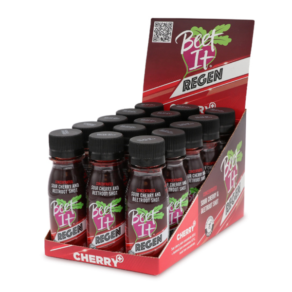 Der Beet It Regen Cherry Shot ist ein „Pre-Recovery“- Produkt, das in den Tagen vor dem Training getrunken wird, um die Regeneration an den Tagen nach dem Training zu unterstützen. Man sollte ihn zusammen mit Beet It Sport Nitrate 400 Shots einnehmen, die reich an diätetischem Nitrat sind und zu mehr Performance beitragen.